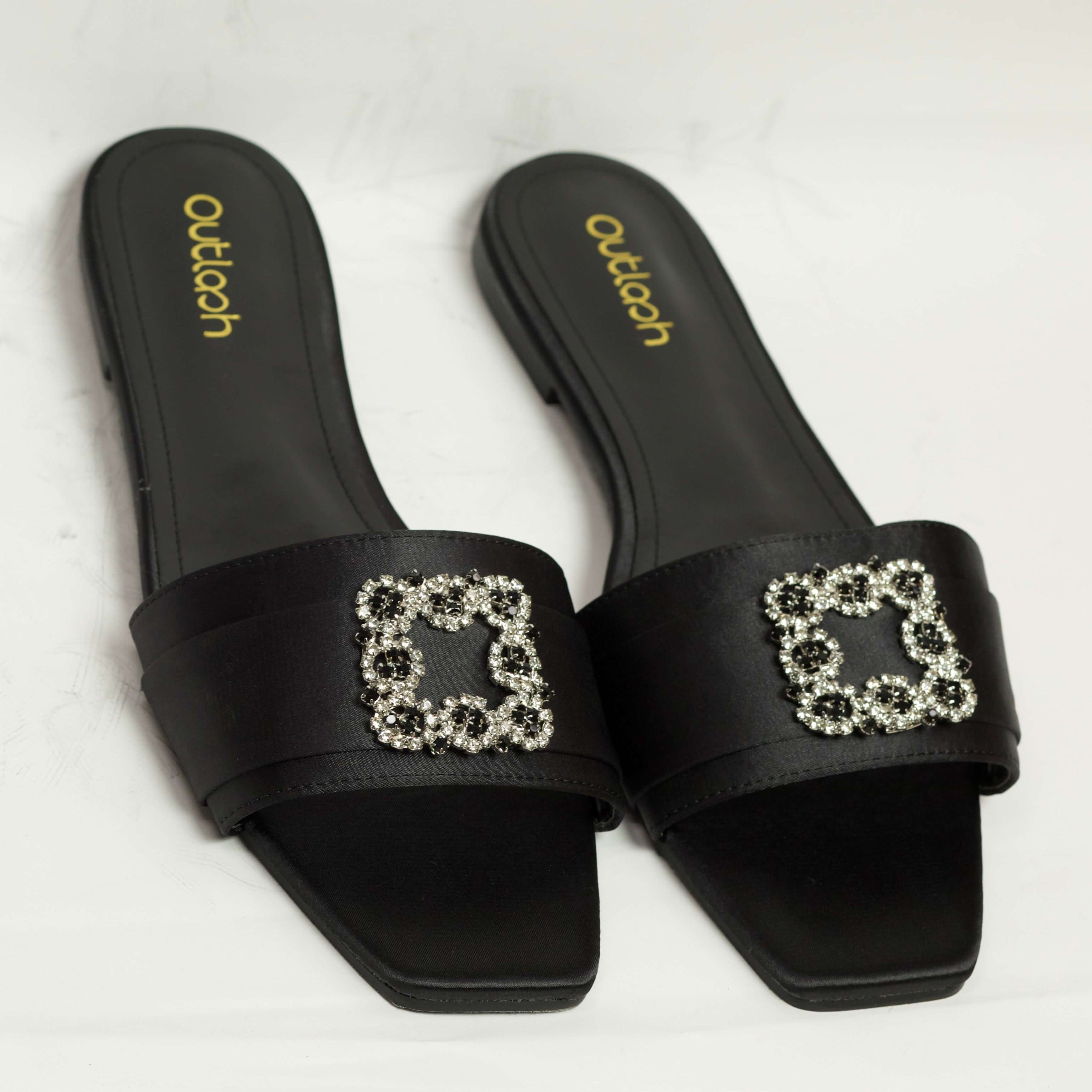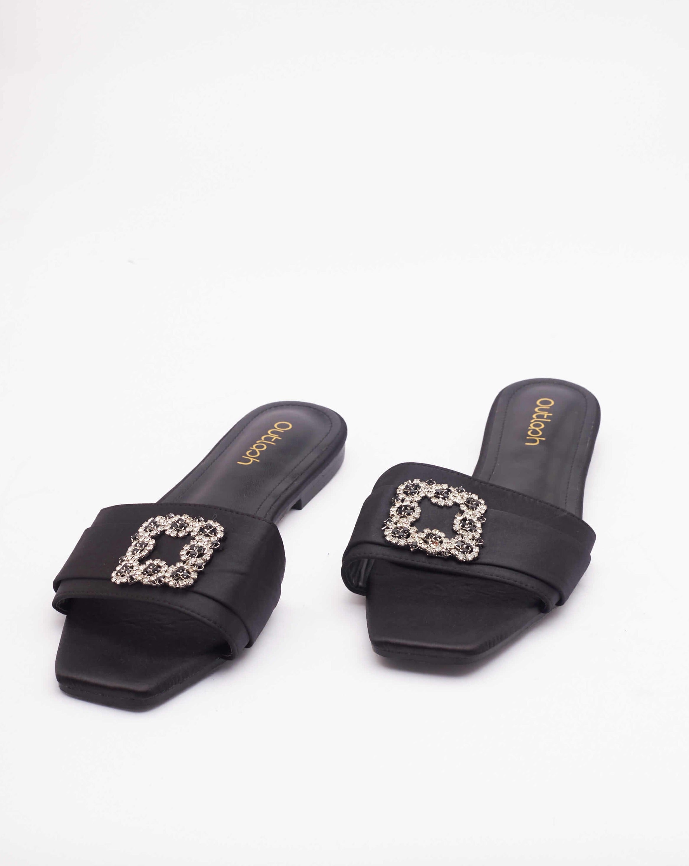 The DAISY Slides feature a square peep toe, open silhouette, and slip-on design, all crafted from luxurious silk leather for a grand and exclusive look. The bedazzled toe-strap adds a touch of glamour, elevating your style to new heights.